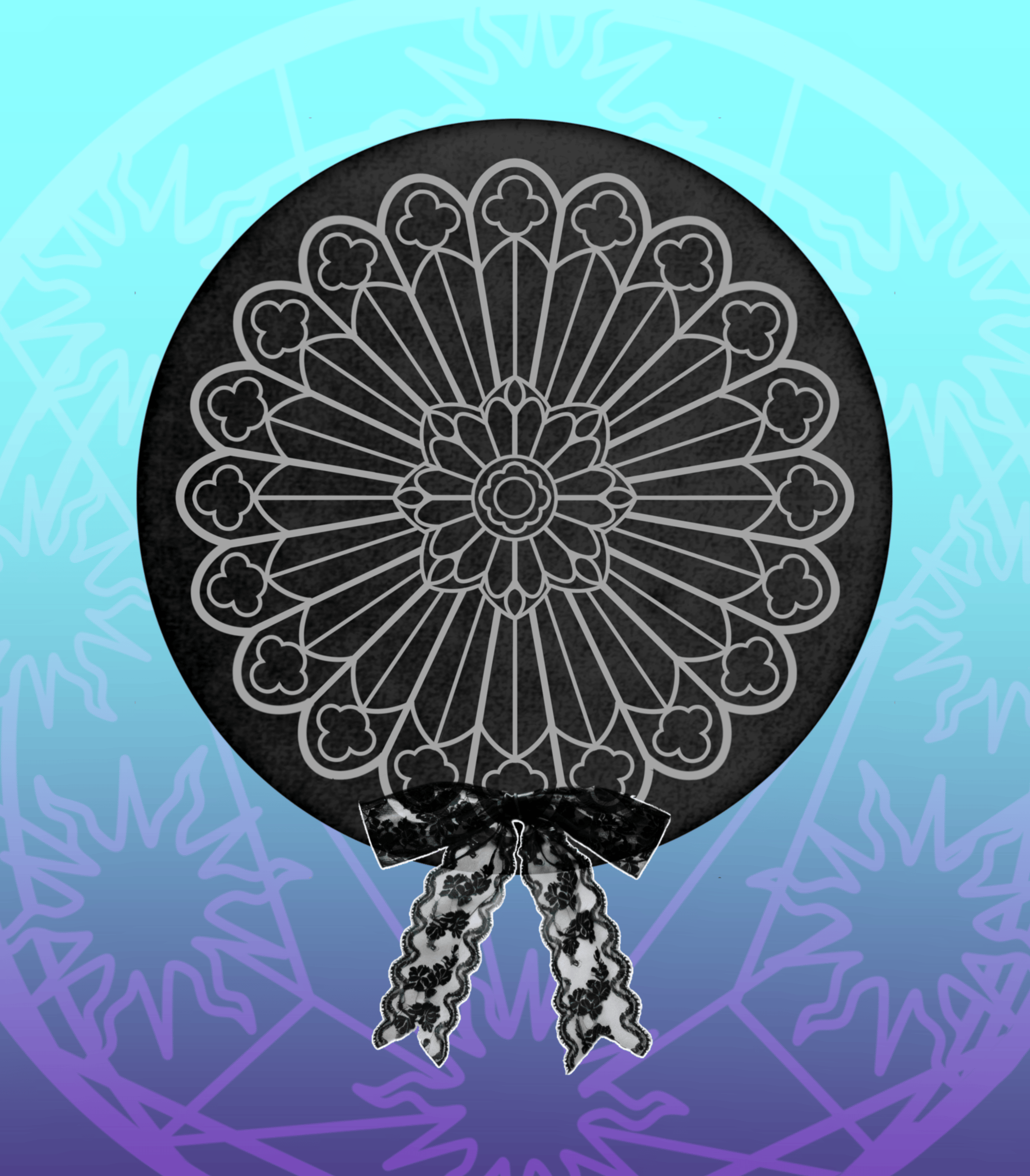 This beret is inspired by the rosace window of Gothic cathedrals. The front is embroidered with a rosace design based on Notre-Dame, detailed and delicate against the black fabric. At the base sits a black lace bow, adding a soft gothic touch.